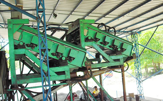 2、重選:黑鎢礦重選金鵬通常采用多級跳汰、多級搖床、中礦再磨的重選流程。細碎后合格礦經過振動篩分級后進行多級跳汰,產出跳汰重選毛砂,粗粒級跳汰尾礦進入磨機再磨,細粒級跳汰尾砂經過分級機后進入多級搖床選別,產出搖床重選毛砂,搖床尾礦排入尾礦庫,搖床中礦返回再磨再選,跳汰和搖床的重選毛砂進入精選作業。